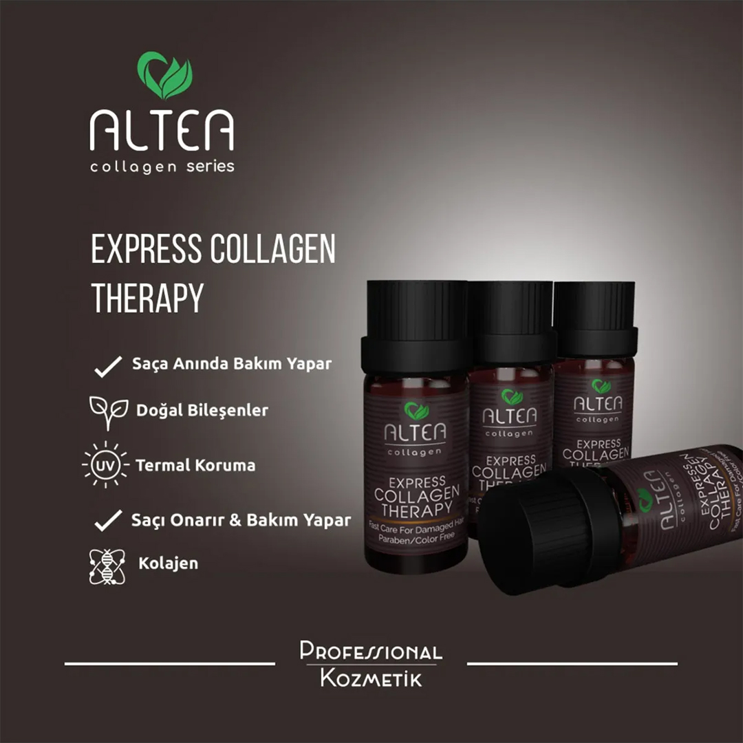 Yıpranmış saç tipleri için özel bir bakım imkanı sunan formül tüm saç tipleri için de kullanıma uygundur. Yıpranmış saçların kaybettiği nemi ve gücü geri kazandırarak hücreleri yenilemesi sayesinde saç derinin yaşlanmasını geciktirir. Sülfat, fosfat, sodyum klorür, paraben, PPG, EDTA ve renklendirici gibi zararlı maddeler içermez. Altea Express Collagen Therapy içeriğinde bulunan kolajen sayesinde saçı besleyerek saçın hızlı bir şekilde uzamasına imkan tanır. Saç bakım desteği ve hidrofobikliğe ek olarak saç kırılmalarını ve kütikül hasarlarını onarma görevini üstlenir. Dış etkenlere bağlı olarak gevşemiş saçları onardıktan sonra termal koruma sağlayarak saçın canlı ve sağlıklı görüntü sunmasına olanak tanır.
